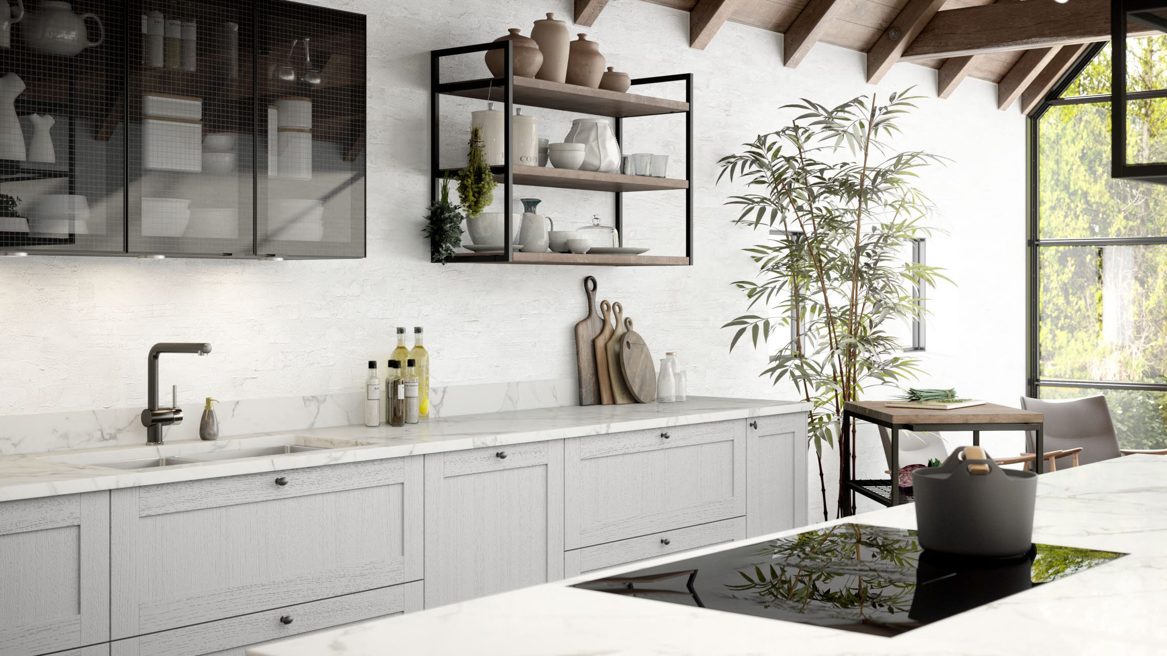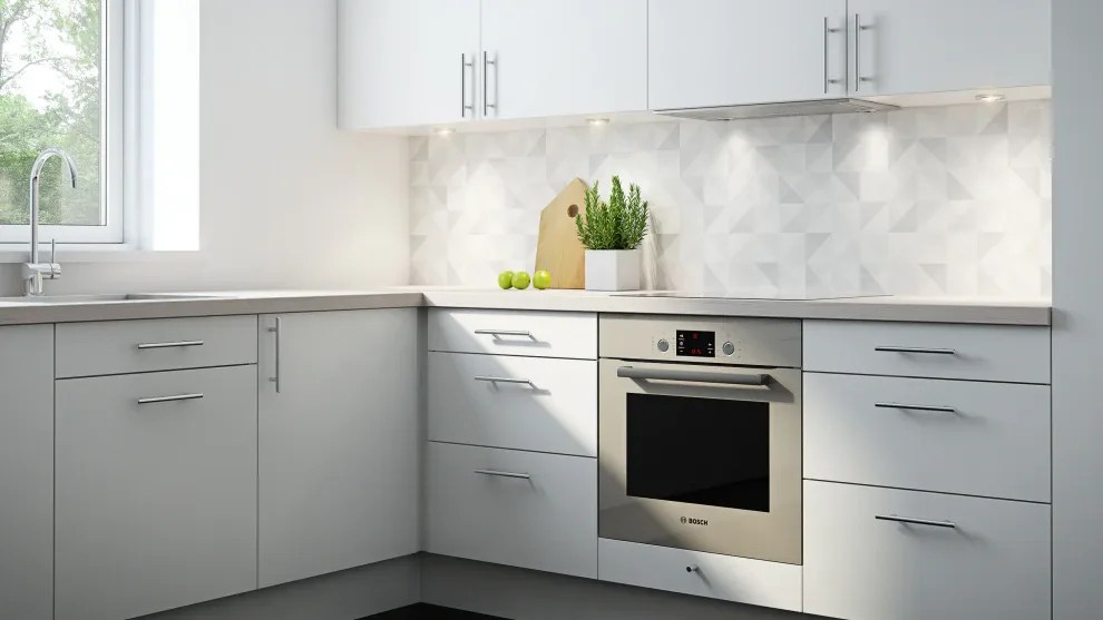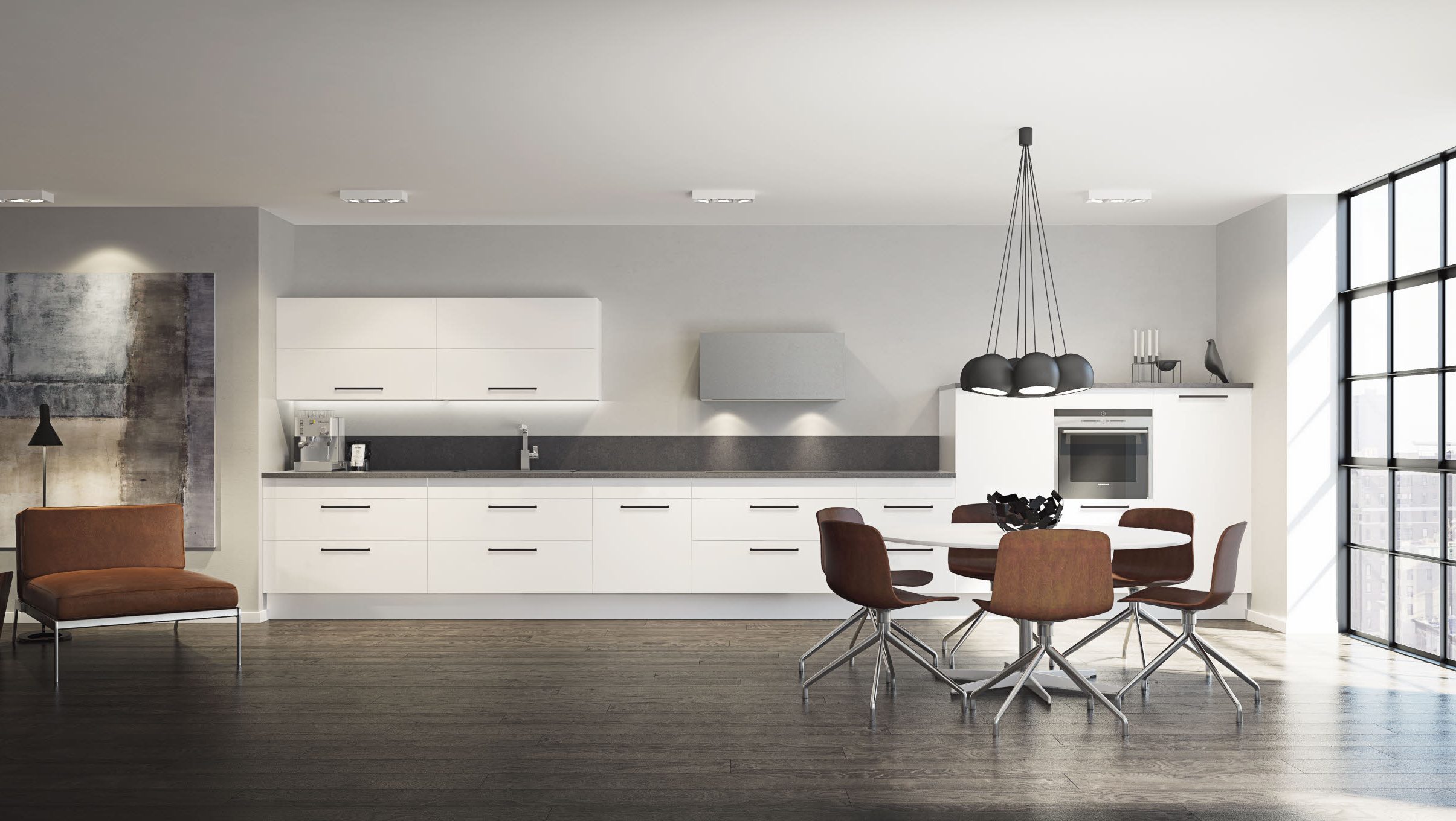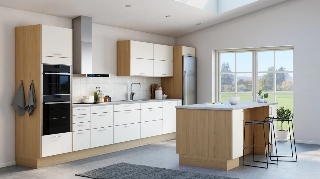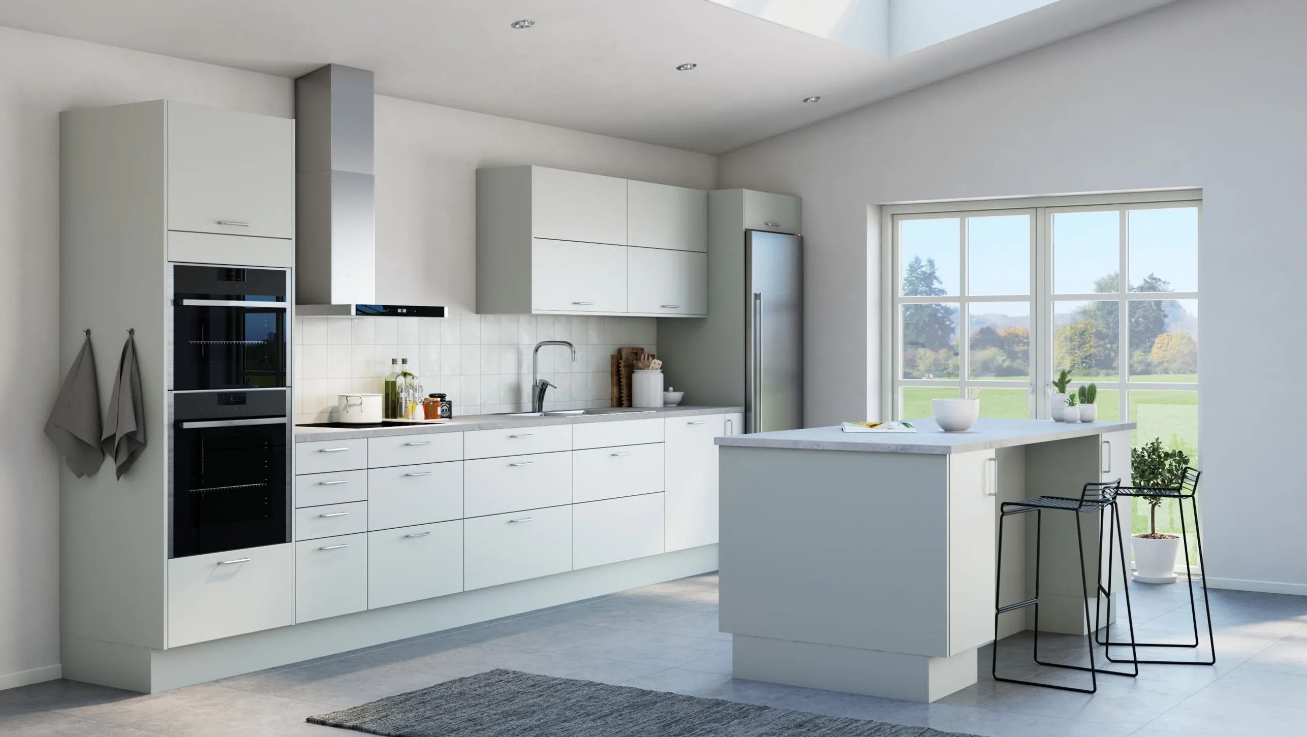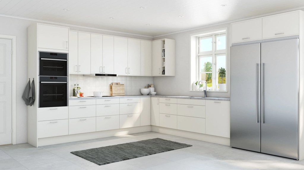 Slette fronter i hvit eller grå melamin er et godt utgangspunkt for et lyst og innbydende trivselskjøkken. Modellens presise og kubistiske formspråk gjør den velegnet for utstrakt bruk av takhøye skapløsninger med god plassutnyttelse.