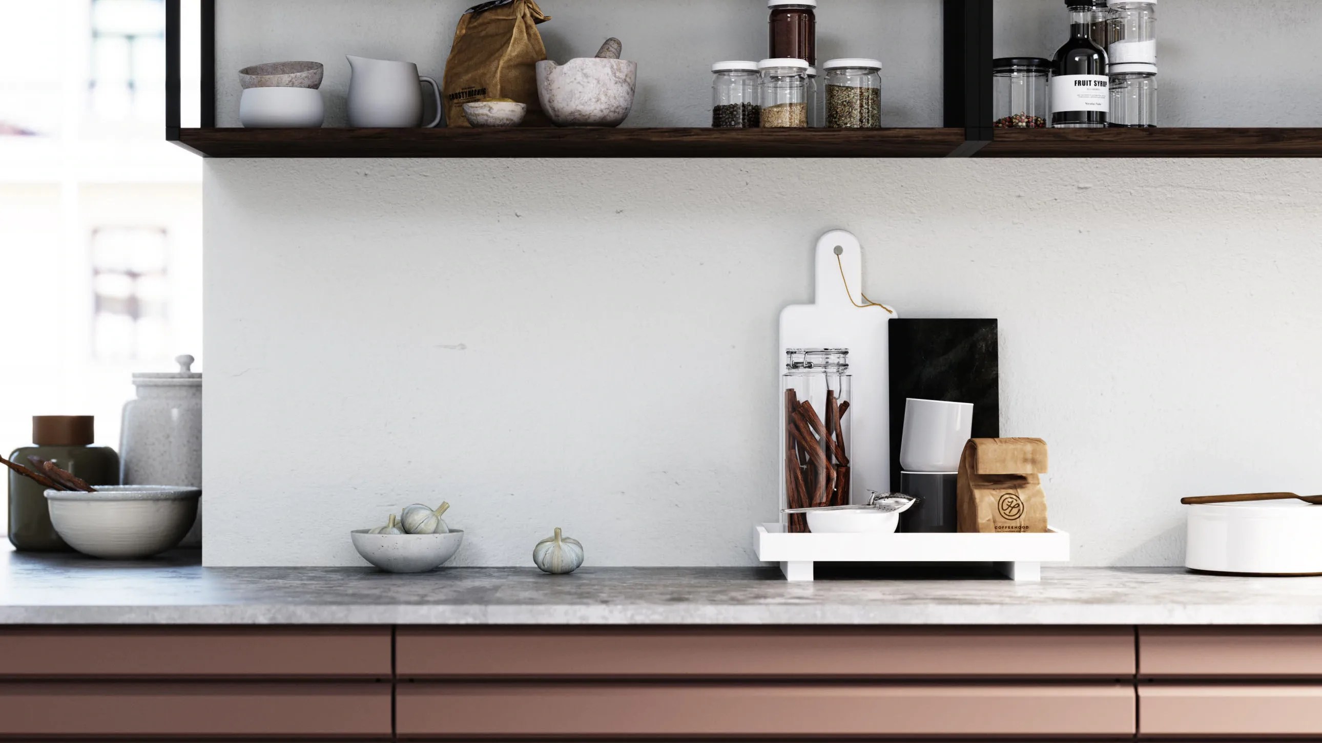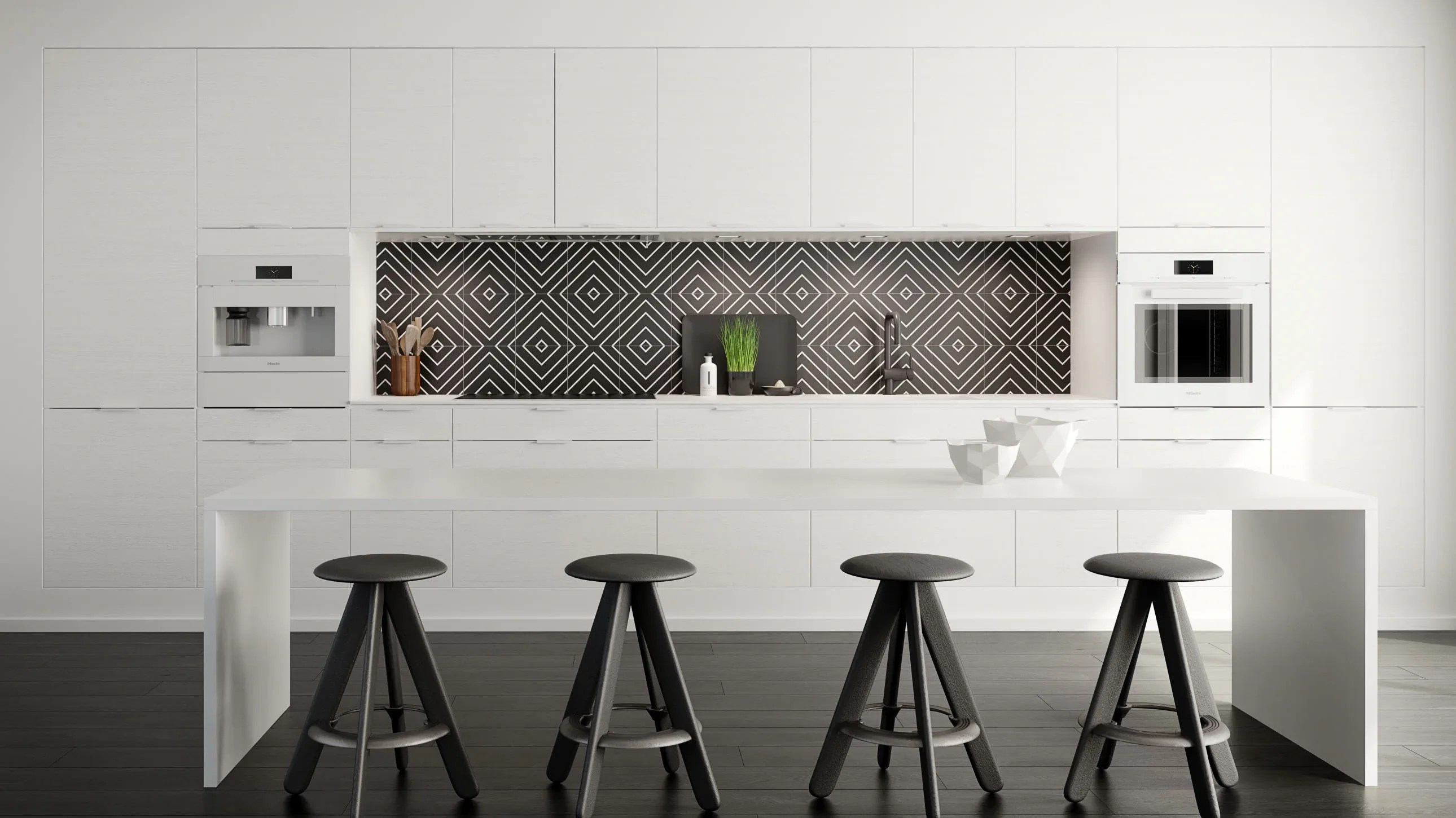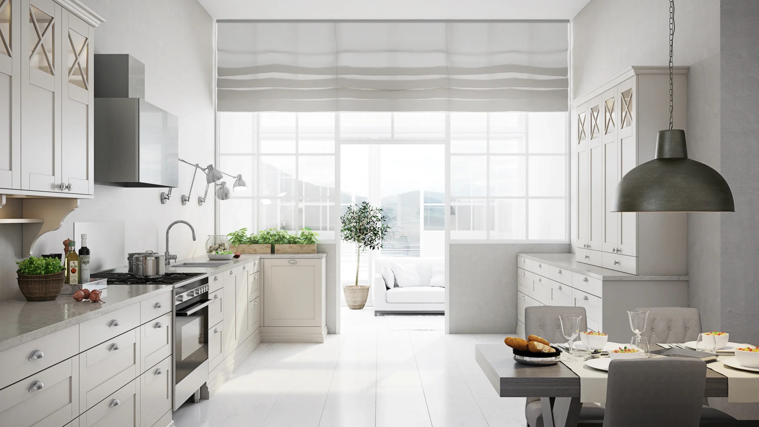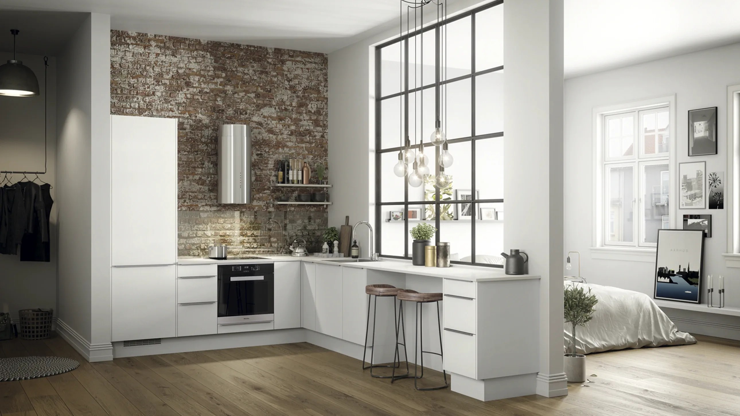 Slette fronter i hvit eller grå melamin er et godt utgangspunkt for et lyst og innbydende trivselskjøkken. Modellens presise og kubistiske formspråk gjør den velegnet for utstrakt bruk av takhøye skapløsninger med god plassutnyttelse.