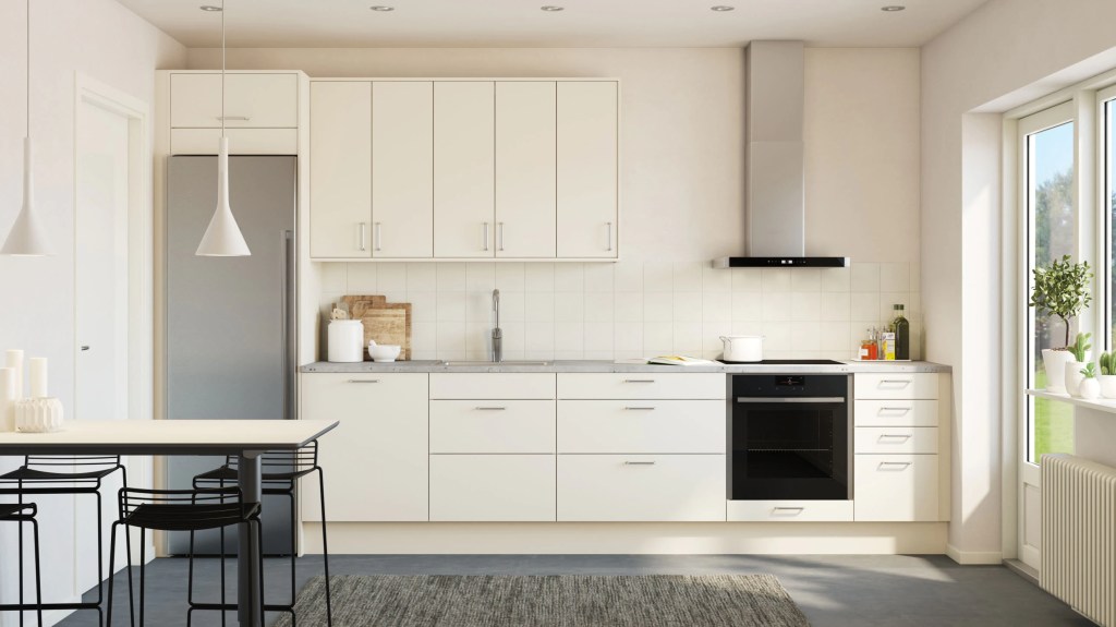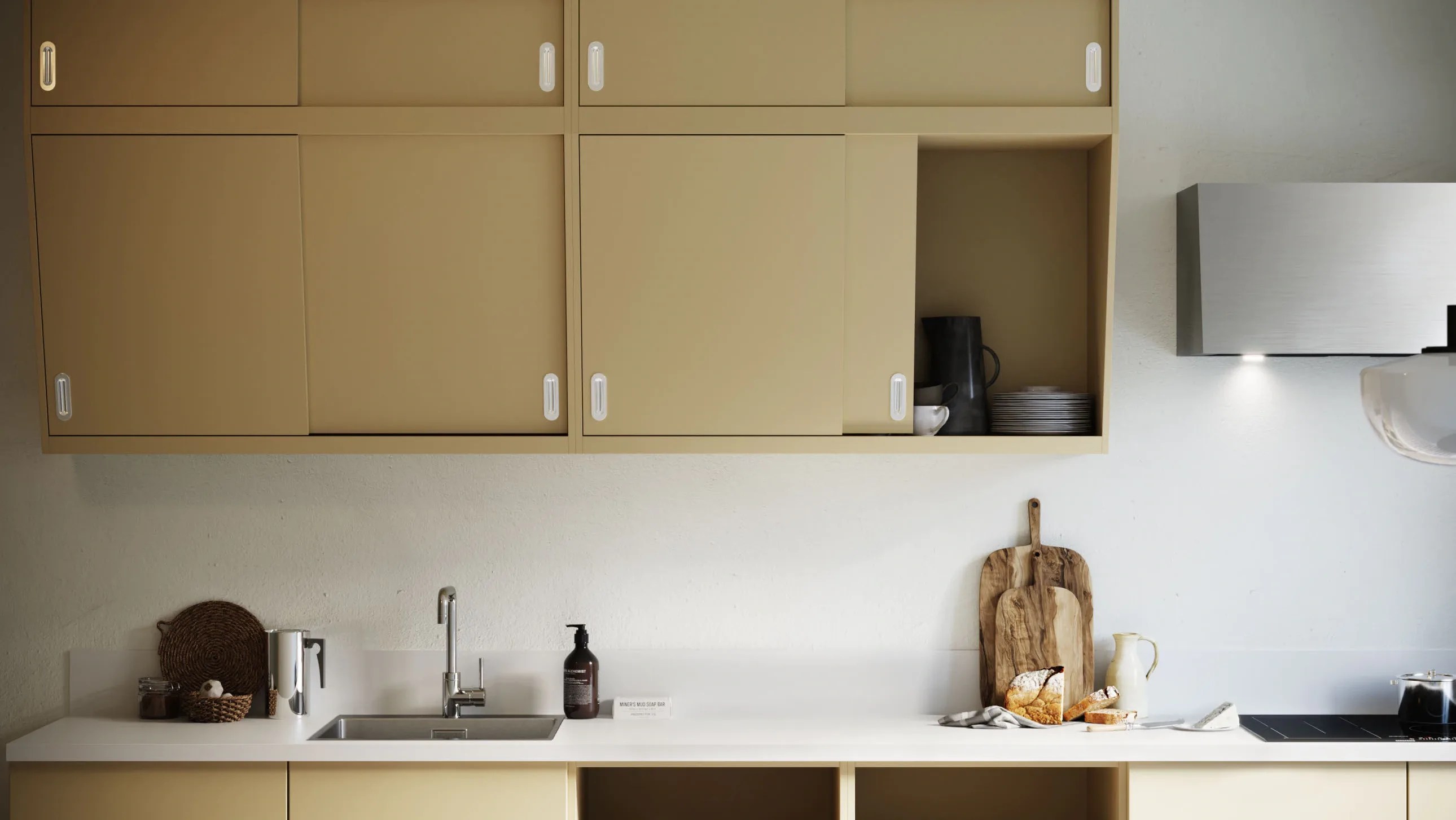 Robust og lettstelt kjøkkenmodell i hvitt høytrykkslaminat. Med sin enkle og rene formgivning er modellen velegnet for voluminnredninger med mye oppbevaringsplass.