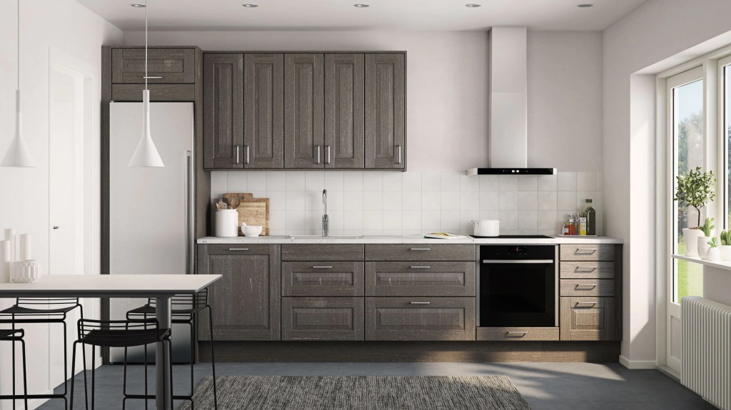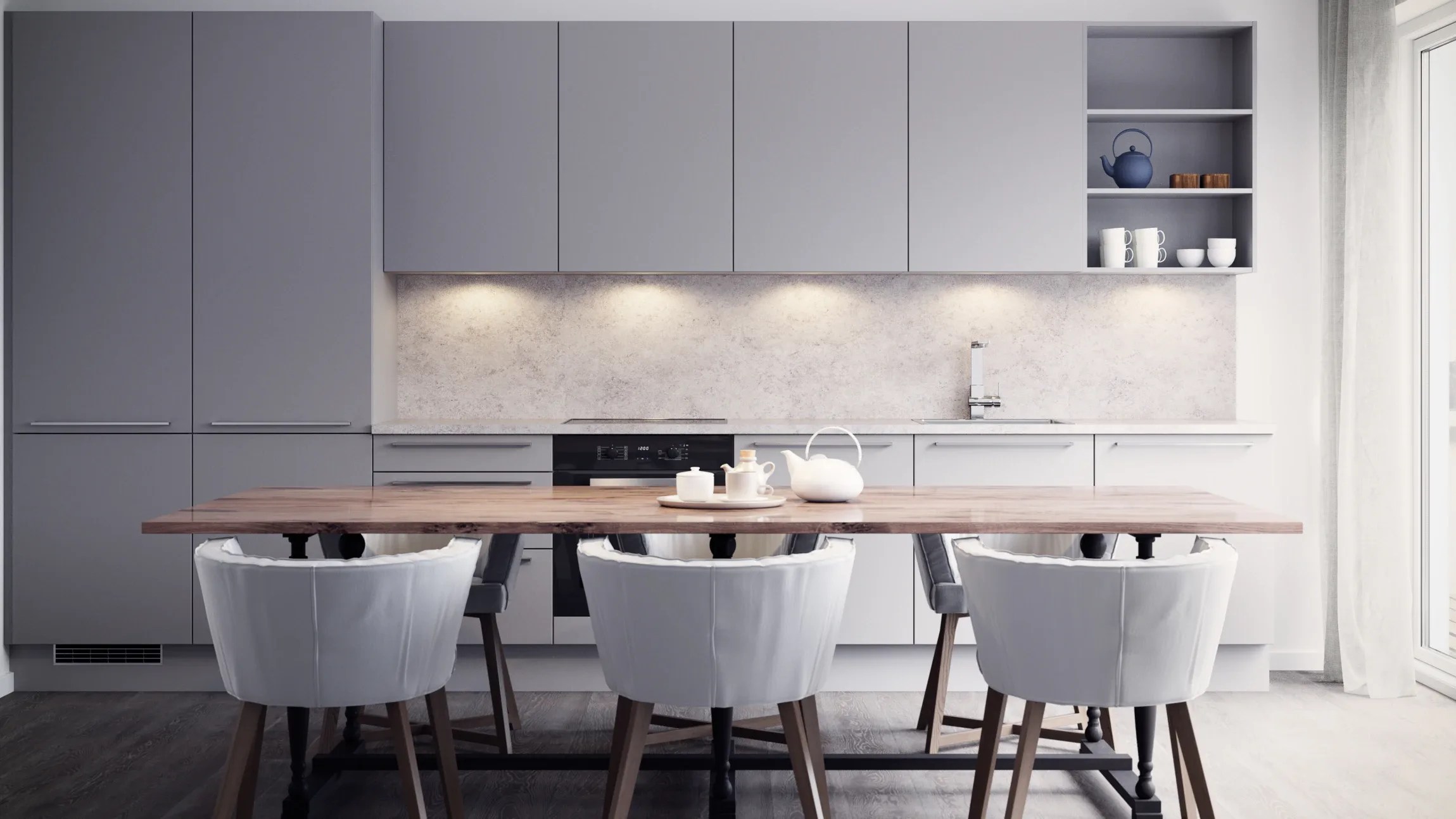 Modell Fjell er et realt brukskjøkken med praktiske egenskaper. Dette er en prisgunstig modell med slette melamin-fronter i en vakker grå farge.