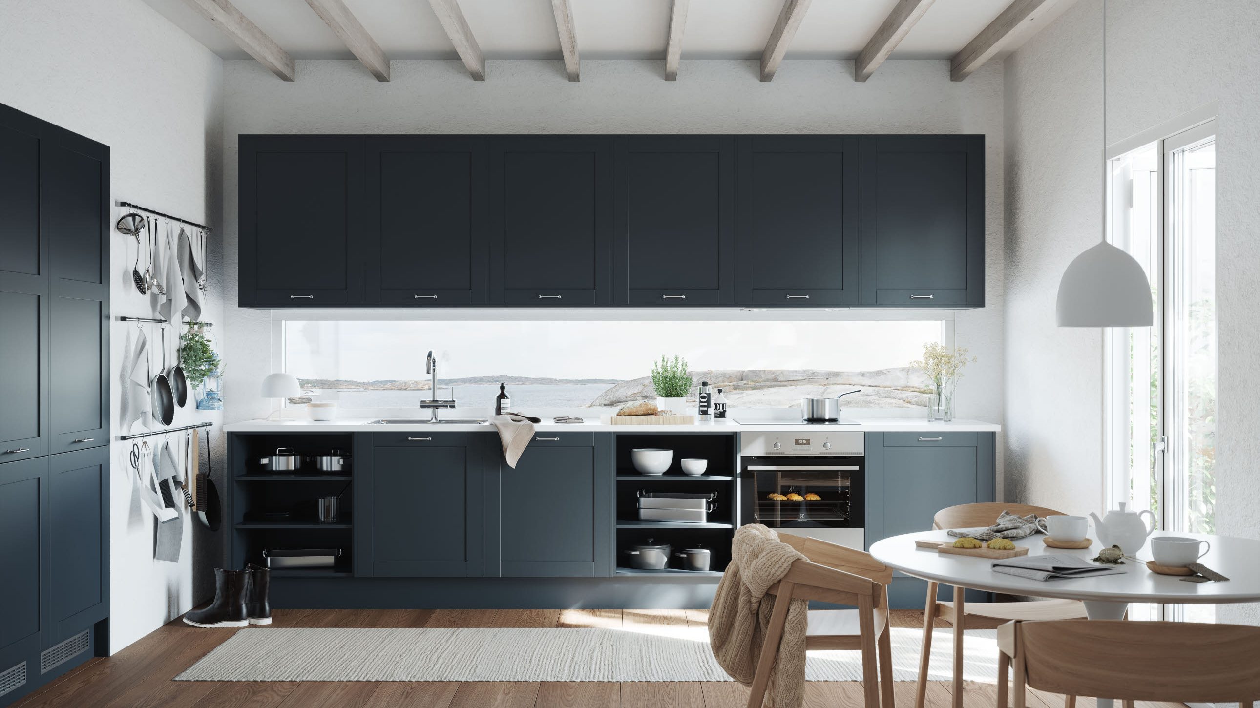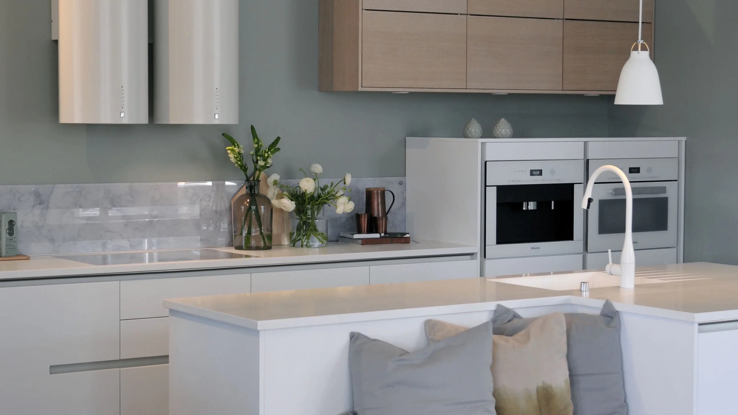 Herlig trendkjøkken med slette fronter og innfreste grep, som markerer modellens linjerene design. Horisont kjennetegnes av en klar og kjølig friskhet, noe som representerer ny nordisk design på sitt beste.