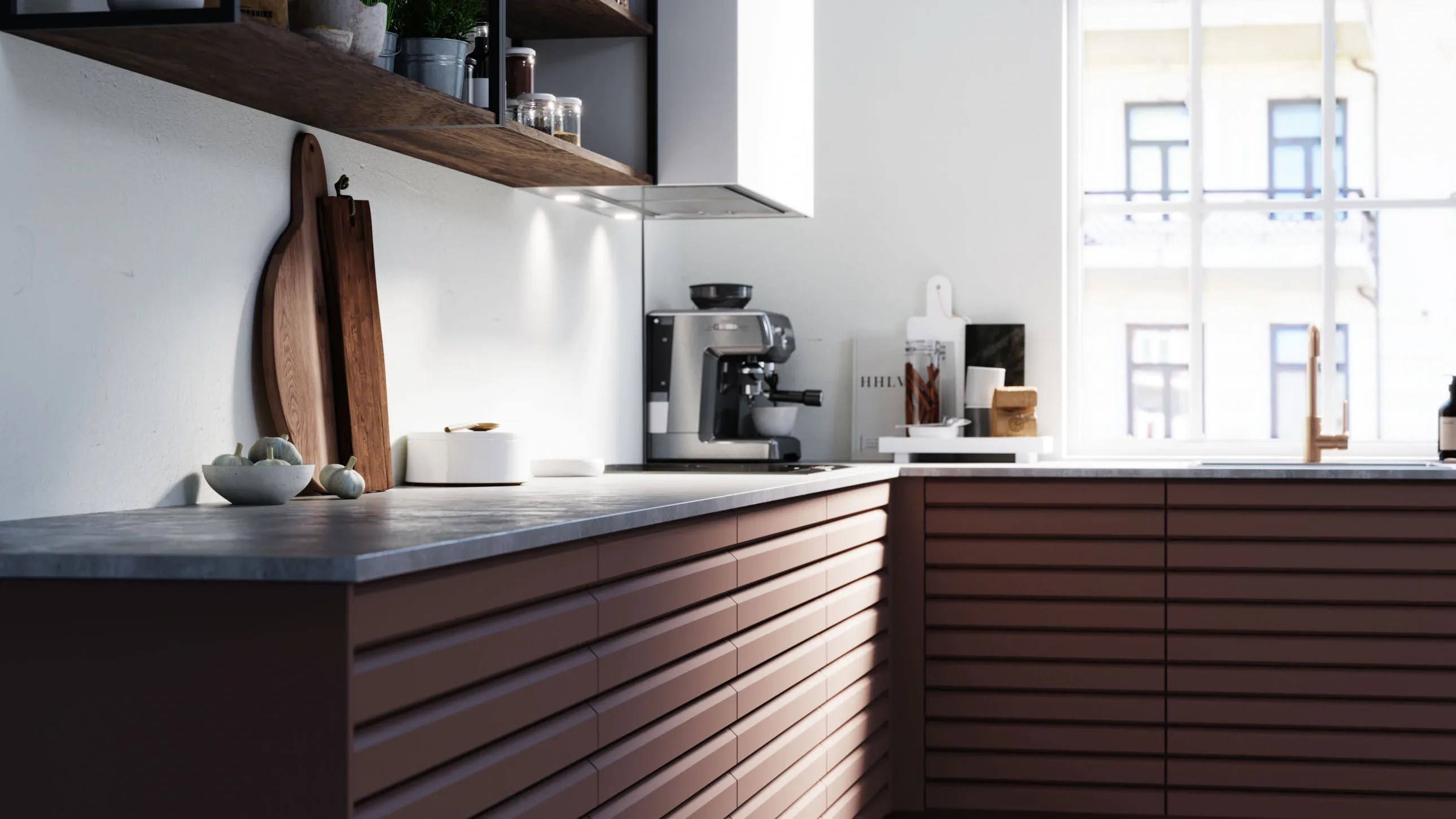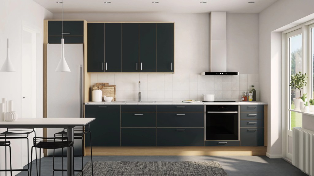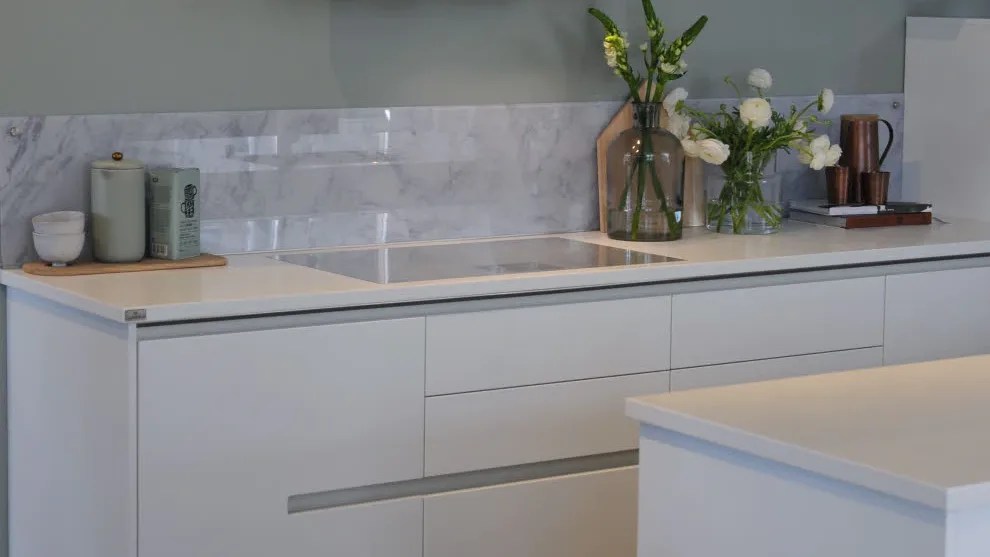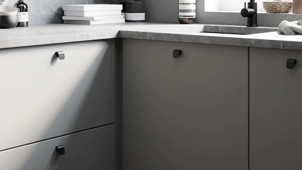 Ny modell i Lineserien, med innovative grepsløsninger. I stedet for tradisjonelle håndtak, har denne modellen avlange utsparinger med innfelte metallister, horisontalt og vertikalt. Du åpner ved å gripe langs dør- og skuffekanter.