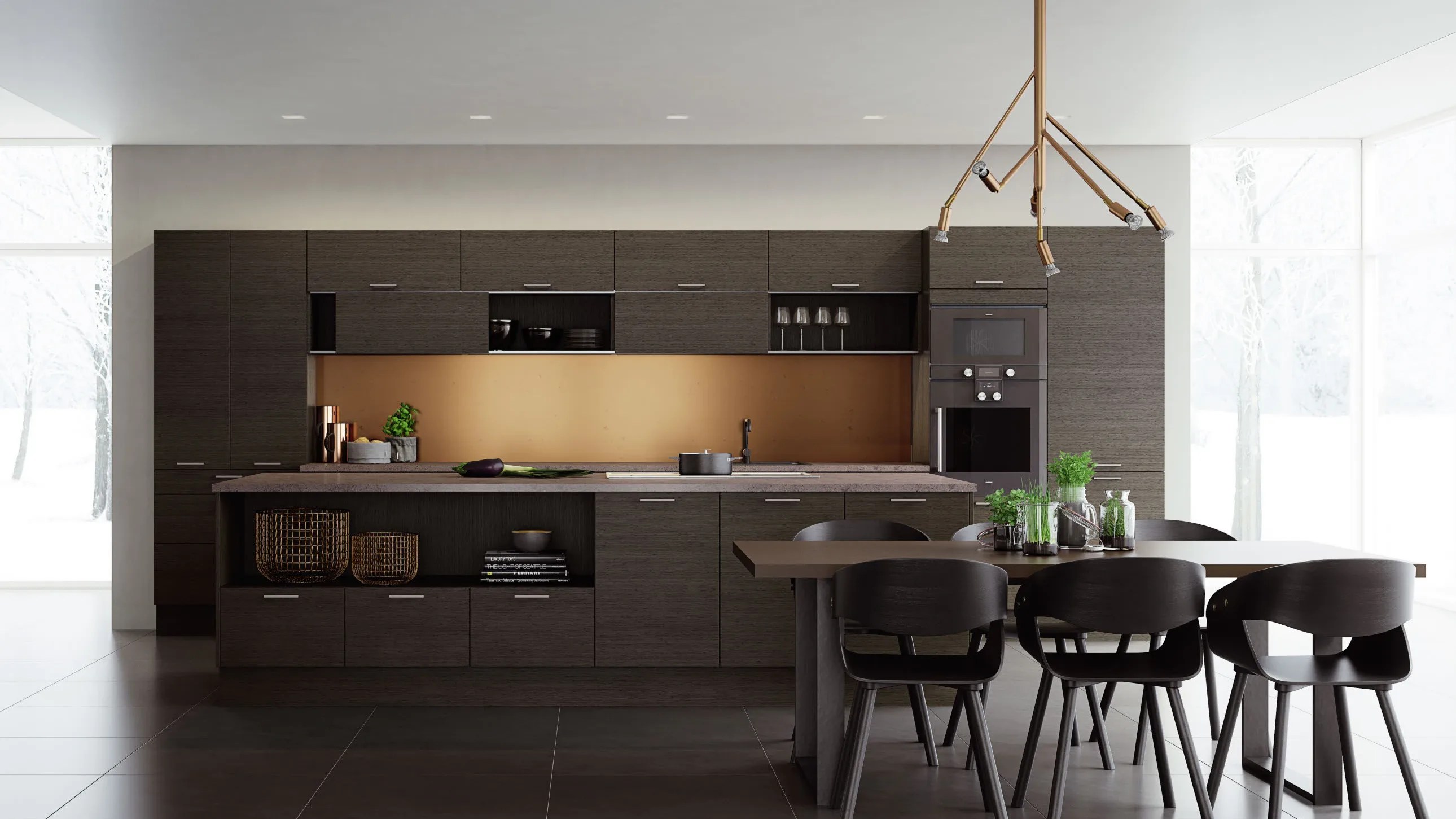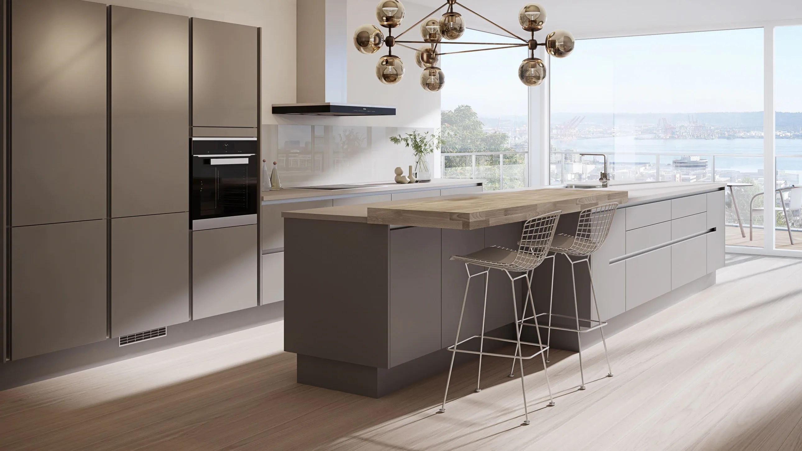 Elegant og moderne eikekjøkken. Slette fronter i eikefinér med integrert kantlist i eik som markerer kjøkkenets linjer og komposisjon.