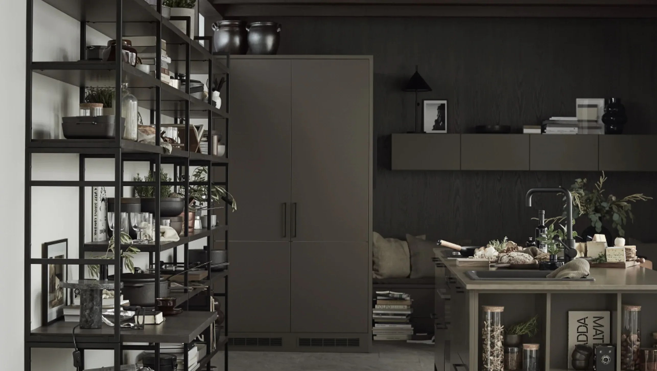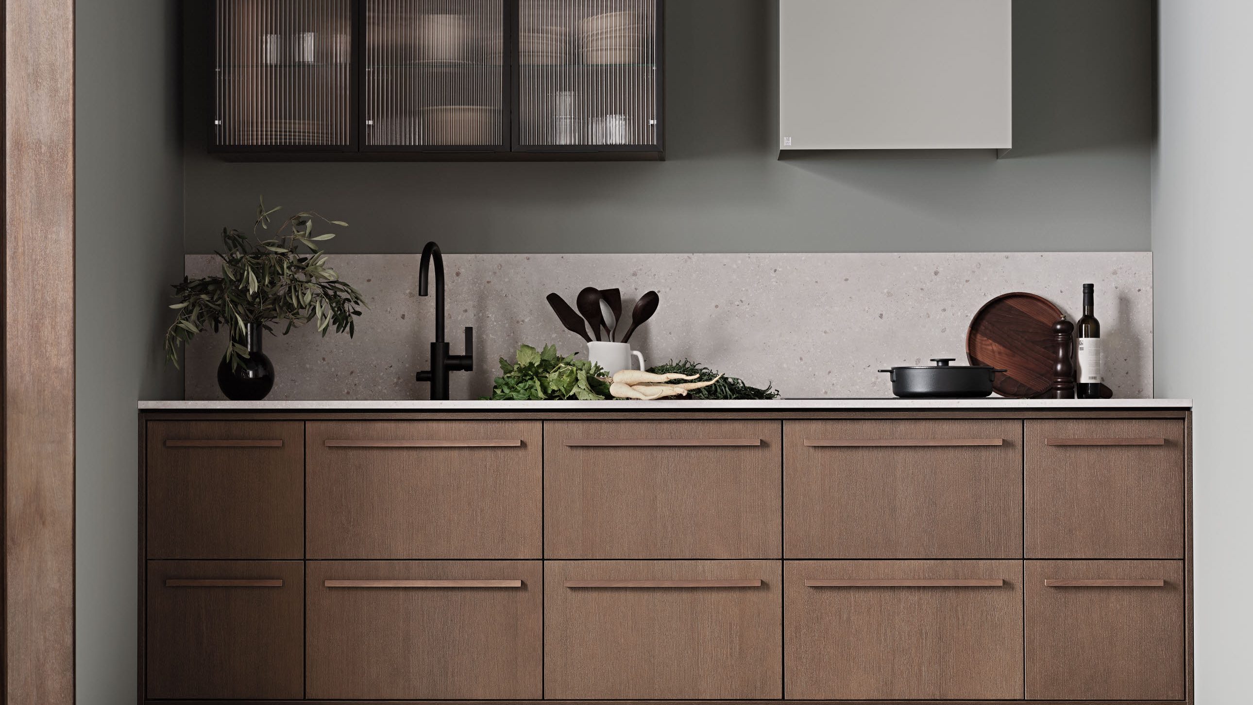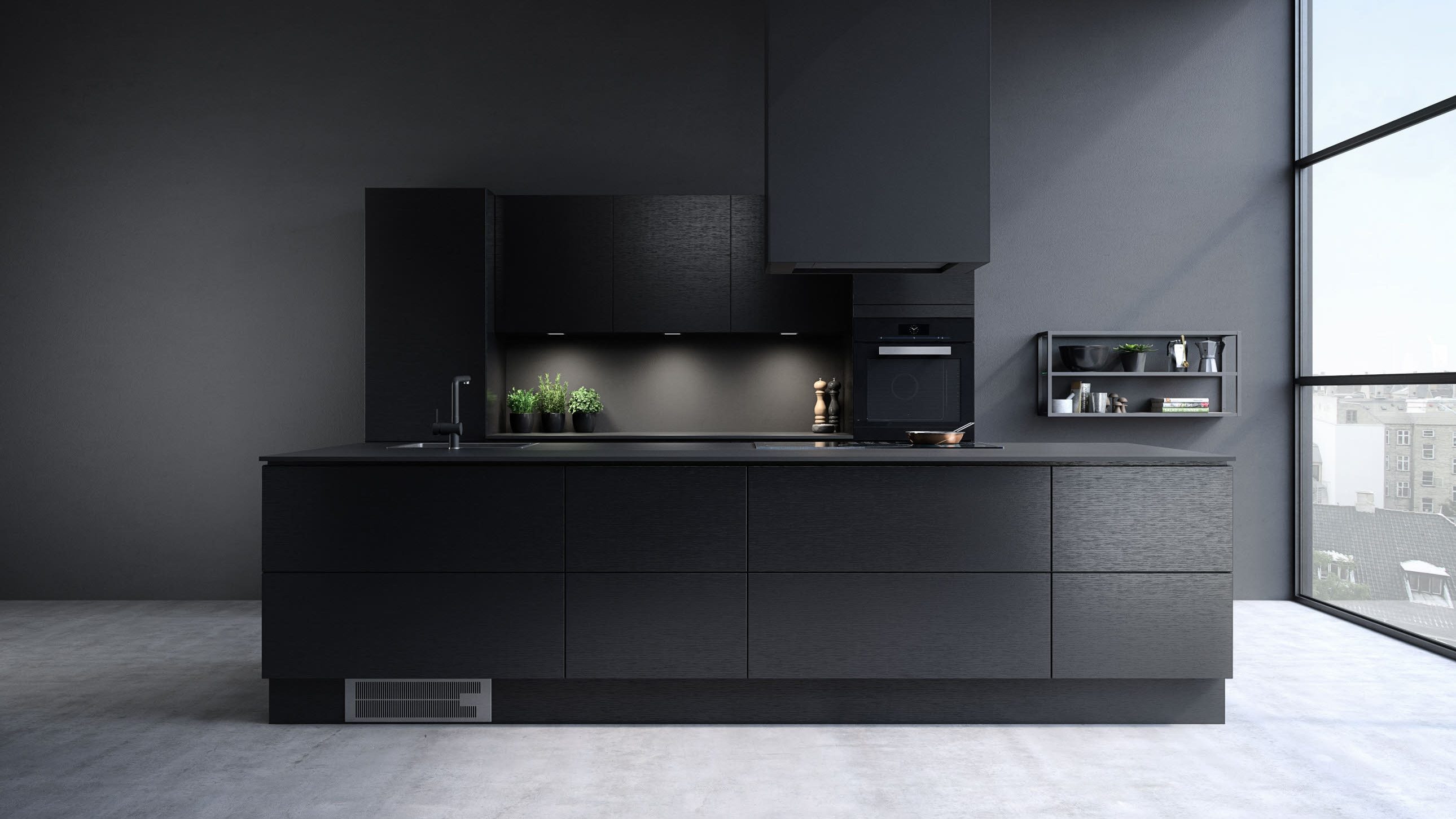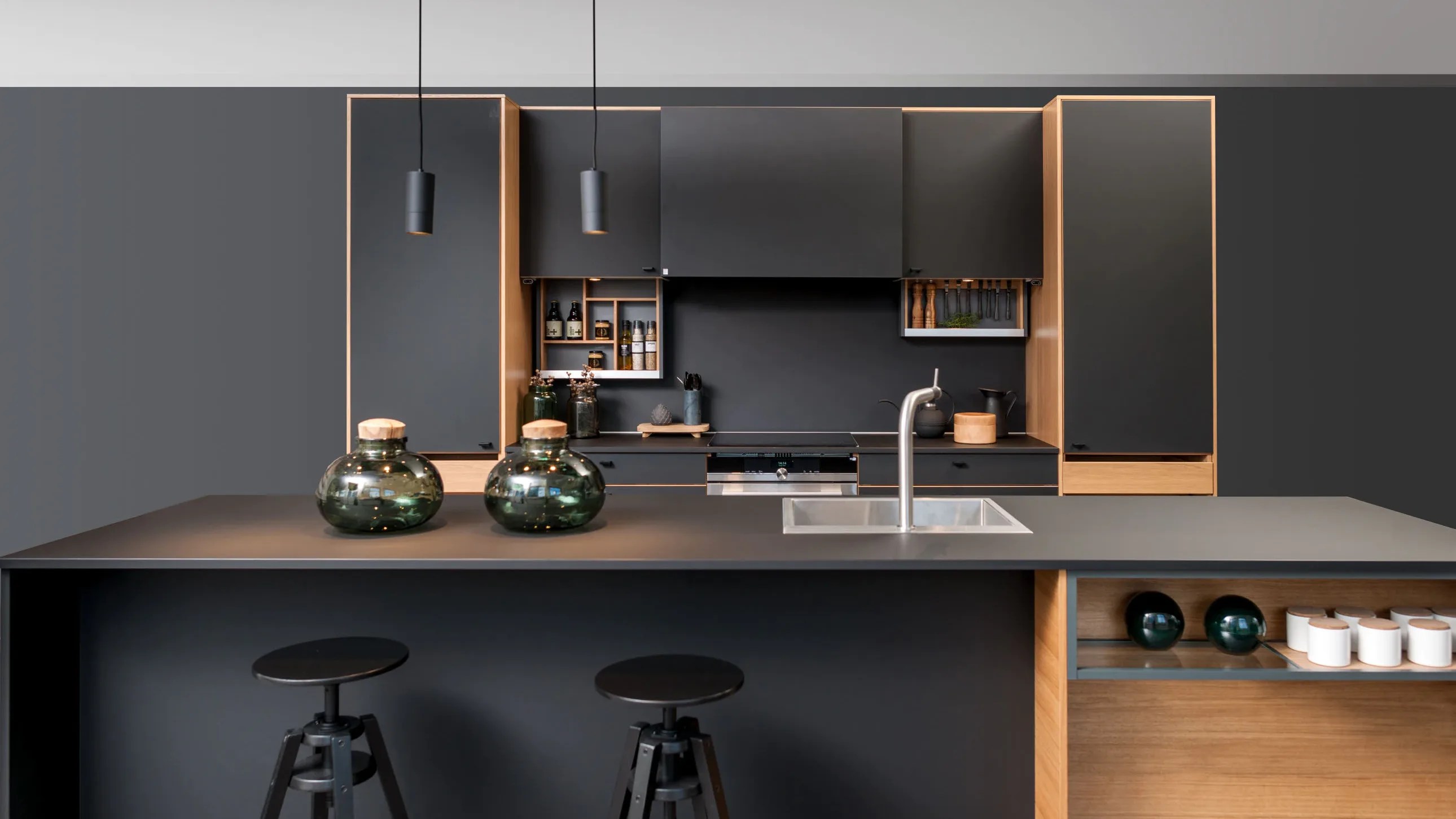 Ønsker du en interiørstil som utstråler diskret eleganse, kan du med hell velge Solido. Modellen har slette fronter i sort supermatt høytrykkslaminat med fasede kantlister i heltre eik. En innbygd hylle i eik tilfører lun kontrast, mens overskapsrekken skaper dybdekontrast til høyskapene, og åpner opp rommet og skaper et luftig innrykk.